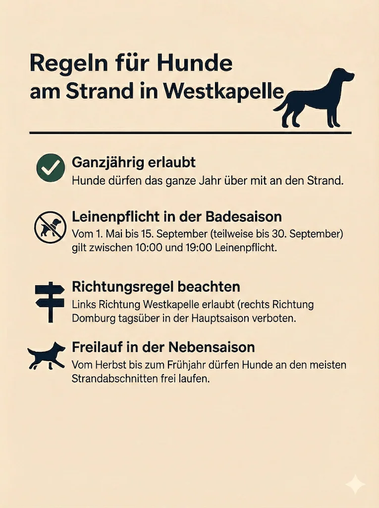 In Westkapelle sind Hunde ganzjährig am Strand erlaubt, was den Ort besonders attraktiv für einen Urlaub mit Vierbeiner macht. Während der Badesaison vom 1. Mai bis 15. September (teilweise bis 30. September) gilt tagsüber zwischen 10:00 und 19:00 Uhr Leinenpflicht. Links in Richtung Westkapelle dürfen Hunde auch in dieser Zeit mitgeführt werden, müssen jedoch angeleint sein. Rechts in Richtung Domburg sind Hunde tagsüber in der Hauptsaison am Strand nicht gestattet. In der Nebensaison dürfen Hunde an den meisten Strandabschnitten frei laufen.